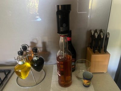 Love the fact that you can choose the the exact ML for the perfect drink. Battery life has lasted for 3 months and has gone through 3 bottles and it's still at 40%. Adaptors are easy to switch out. I just need to find a better box to secure it in for storage or travel.